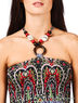 Легкий длинный сарафан с открытой зоной плеч. Топ-широкая резинка с завязкой на шее, украшенной деревянными бусами. Сарафан декорирован ярким цветочным принтом.