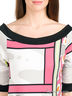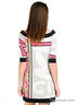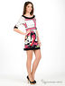 Свободное платье с рукавами до локтя, с открытой линией плеч. Яркий цветочный принт по передней планке и геометрический узор по задней части.