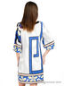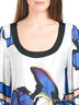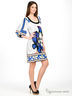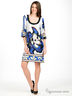 Свободное платье с рукавами 3/4 и круглым вырезом. Яркий цветочный принт по передней планке и геометрический по задней. Выполнено из гладкого эластичного материала.