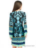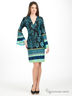 Платье на запах на поясе, с длинными широкими рукавами и глубоким V-образным вырезом, декорировано контрастными полосами и цветочным орнаментом.