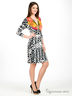 Платье на запах, с V-образным вырезом, рукава 3/4, декорировано широким поясом и ярким цветным орнаментом.