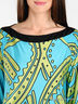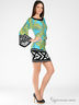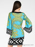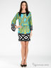 Коктейльное платье с глубоким круглым вырезом. Декорировано ярким принтом, длинный расклешенный рукав, небольшая сборка по боку изделия.