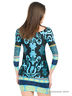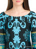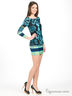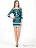 Свободное платье с рукавами до локтя, с открытой линией плеч. Заниженная талия на резинке. Декорировано контрастным орнаментом.