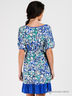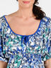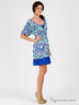 Детали: глубокий вырез горловины с завязкой, короткий рукав, линия талии подчеркнута многорядной резинкой, оборка, принты