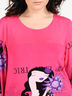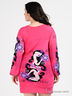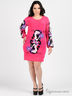 Детали: округлый вырез горловины, длинный рукав и низ изделия посажены на манжеты, принты