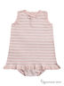 Нежный комплект в полоску из 100% хлопковой пряжи , состоящий из платья и трусиков. Платье без рукавов с круглым вырезом горловины, сзади застежка на пуговицы, низ украшен рюшей. Трусики на эластичной резинке по краям. Прекрасный вариант для повседневной носки.