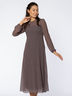 Детали: длинные рукава, круглый вырез, застежка на молнию и пуговицу, длина миди