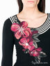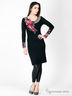 Прилегающий силуэт, средняя длина. Длинный прямой рукав-реглан. Широкий округлый вырез горловины. Манжеты рукавов и вырез горловины окантованы широкой полосой ткани расцветкой в полоску. На левом рукаве и полочке пришита аппликация в виде ярких цветов.