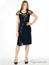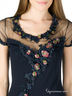 Трикотажное платье прямого кроя. Круглый вырез горловины. На груди вставка из сетчатой прозрачной ткани. Короткие рукава из сетки, по краю окантованные трикотажной резинкой. Внизу спереди небольшой вырез с прозрачной трикотажной вставкой. Полочка, горловина и вырез украшены искусственными цветами, бусинами и стразами.