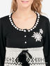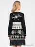 Детали: округлый вырез горловины, застежка на кнопки, длинный прямой рукав, завышенная талия на кулиске с помпонами, полочка декорирована вышивкой в виде снежинок и стразами