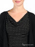 Трикотажное платье прямого покроя с принтом горох. Вырез качели. Рукава 3/4. По бокам широкие оригинальные оборки.