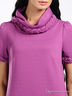Платье прямого кроя из плотного трикотажа. Ворот-хомут и короткие рукава украшены косичкой. Отрезной низ платья собран широкой резинкой.