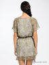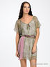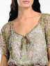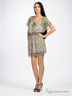 Двухслойное платье из струящейся ткани свободного кроя. Глубокий V-образный вырез горловины завязывается на шнурки. Цельнокроеный рукав. На талии присборено резинкой. Шлевки на талии и шифоновый пояс.