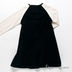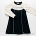 Оригинальное платье из слегка эластичного велюровового материала контрастных цветов. Круглый вырез, длинный рукав. Декорировано серебристой тесьмой и вставкой с пайетками.