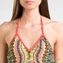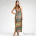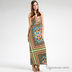 Легкая тонкая трикотажная ткань. Лиф отрезной, выполнен из двойной ткани, присборен по линии выреза горловины. Трикотажная окантовка лифа переходит в ленту, которая, завязывается на шее. Длинная прямая юбка ложится мягкими складками.