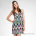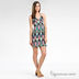 Платье из нежной трикотажной ткани с расклешенной юбкой. Отрезной лиф с V-образным вырезом с нахлестом. Тонкие лямки, завязывающиеся на шее. Край спинки на резинке. Платье яркой летней расцветки.