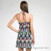Платье из нежной трикотажной ткани с расклешенной юбкой. Отрезной лиф с V-образным вырезом с нахлестом. Тонкие лямки, завязывающиеся на шее. Край спинки на резинке. Платье яркой летней расцветки.