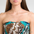Тонкий трикотаж. Лиф платья без бретелей, стянут многорядными резинками. Юбка свободного расклешенного кроя. На полочке металлическая декоративная нашивка с логотипом марки.