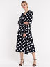 Платье на запах женское в горох из принтованного тканного полотна от бренда Barmariska. Приталенный силуэт. Длинные рукава с широкими манжетами. Детали: на манжетах рукавов три пуговицы на ножках под жемчуг, два пояса, пристроченные к полочкам, брендированный металлический шильдик на полочке справа. Цвет изделия может незначительно отличаться от цвета изделия на фото. Допустимое отклонение от размерной сетки +/- 1 сантиметр.