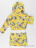 Платье приталенного силуэта с капюшоном с кулиской. Застежка на молнию, длинные рукава. Рукава посажены на трикотажные резинки. Отрезной трикотажный пояс с кулиской. Изделие украшено рисунками.