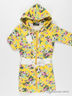 Платье приталенного силуэта с капюшоном с кулиской. Застежка на молнию, длинные рукава. Рукава посажены на трикотажные резинки. Отрезной трикотажный пояс с кулиской. Изделие украшено рисунками.
