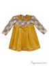 Комбинирование тканей, защипы от талии, отделочная полоса по подолу, вставка на груди с декоративным навесным элементом "сердечко", застёжка на пуговицу.