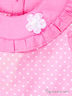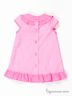 Детали: округлый вырез горловины, короткие рукава-крылышки, застежка на пуговицы, подол дополнен оборкой. Модель декорирована трикотажным цветком с бусинкой.