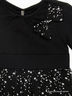 Отличное нарядное платье прекрасно подойдет для праздников. Модель с короткими рукавами и округлым вырезом горловины, украшена декором.