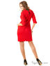 Красное платье с воротничком "хомут" и рукавами 3/4 с длинными шлевками, украшенные пуговицей с камнем. По всему платью проходят швы с отделочной строчкой. Длина изделия около 96 см.