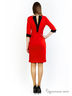 Красное платье из мягкой трикотажной ткани с черной отделкой. Карманы с накладными клапанами на пуговице. По спинке разрез с отворотами, декорированный цепочкой и пуговицами. Длина изделия около 100 см.