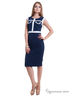 Платье офисного стиля из темно-синей костюмной ткани с отделкой из белого материала. По полочке карманы-клапаны. Модель с короткими рукавами и округлым вырезом горловины. Длина изделия около 102 см.