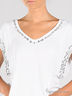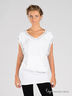 Платье-туника из мягкой струящейся ткани. Оригинальный крой. Очень короткий широкий рукав и окантовка ворота декорированы стразами. На полочке расположен оригинально выполненный карман-"кенгуру".