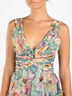 Воздушное платье из жатого шифона. Отрезной лиф с V-образным вырезом, глубина выреза регулируется с помощью крючков. Талия подчеркнута оригинально выполненным втачным поясом. Юбка с запахом, без подъюбника. Лиф декорирован крупными пайетками и стразами. Застежка - потайная молния, расположена на спинке изделия.