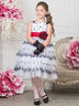 Оригинальный праздничный комплект для девочек школьного возраста. Платье приковывает взгляды благодаря ярким деталям. Лиф на тонких атласных бретелях с застежкой-молнией. Воздушная многоярусная юбка из фатина украшена симметричными клиньями и тесьмой. Подъюбник дополнен пышными оборками из жесткой сетки. Платье украшает черная цветочная вышивка и графический орнамент. Идеальную посадку по фигуре обеспечивают контрастный алый пояс с брошью в форме бутона розы и корсетная шнуровка сзади. Нарядное черное болеро украшено присборенным кружевом и атласными лентами, оно великолепно дополняет образ.
