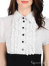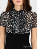 Детали: отрезной лиф декорирован оригинальным принтом и оборками; отложной ворот; короткий рукав на резинке; застегивается на пуговицы