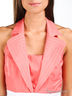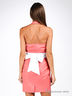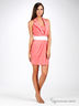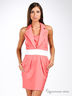 Эффектное платье кораллового цвета из плотного, шелковистого материала. Отложной воротник. Лацканы декорированы контрастной прострочкой. Глубокий V-образный вырез. Открытая спина. Верх спинки посажен на резинку. На лифе подкройные вытачки. Широкий втачной пояс с завязками. Два втачных кармана. Сзади небольшой разрез. Застегивается на молнию на спине.