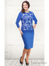 Эффектное платье полуприлегающего силуэта, длина чуть ниже колена. Длина рукава 3/4. Вырез горловины круглый с бейками. Платье отрезное ниже линии талии. Лиф выполнен из кружева. Подкладка по лифу из вискозы. Низ платья и рукава выполнены из фактурного трикотажного полотна. Бейка по горловине украшена пятью пришивными стразами модного дизайна.
