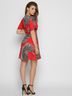 Дизайнерское летнее платье от Carica. Модель на запАх. Имеет мини длину, v-образный вырез и короткий расклешенный рукав. Талию подчеркивает пришивной пояс. По ткани яркий тропический рисунок. Спереди и на подоле декор в виде оборок.