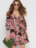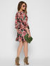 Романтичное летнее платье. Модель с имитацией запАха. Имеет мини длину, v-образный вырез и рукав ¾. Для удобства, талия и рукава оформлены эластичными резинками. Особенность – декор рюшами на подоле и манжетах. По ткани цветочный рисунок.