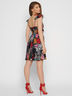 Оригинальное мини-платье для летнего сезона. Модель имеет v-образный вырез и завышенную талию. Тонкие регулируемые бретели оформлены рюшей в цвет изделия. Особенность – широкая резинка ниже лопаток, благодаря которой сзади образуются эффектные складки. По ткани тропический узор.