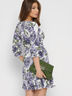 Романтичное летнее платье. Модель с имитацией запАха. Имеет мини длину, v-образный вырез и рукав ¾. Для удобства, талия и рукава оформлены эластичными резинками. Особенность – декор рюшами на подоле и манжетах. По ткани цветочный рисунок.