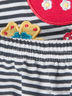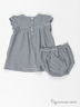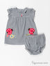 Легкое платье с трусиками для девочки. Округлый вырез горловины, короткие рукава, сзади застежка на кнопки. Модель украшена оригинальными нашивками.
