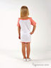 Модель прямого кроя с широким вырезом горловины. Горловины, манжеты и низ изделия обработаны оборками. Крупная декоративная аппликация на полочке.
