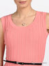 Трикотажное платье без рукавов с глубоким круглым вырезом. Декорировано функциональным поясом. Трикотажная ткань в рубчик.