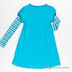 Расклешенное платье с длинным рукавом и эффектом двойки. Верхний рукав присборен. Боковые присбаривающие резинки обозначают завышенную линию талии. Подол украшен аппликацией.
