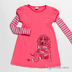 Расклешенное платье с длинным рукавом и эффектом двойки. Верхний рукав присборен. Боковые присбаривающие резинки обозначают завышенную линию талии. Подол украшен аппликацией.