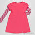 Расклешенное платье с длинным рукавом и эффектом двойки. Верхний рукав присборен. Боковые присбаривающие резинки обозначают завышенную линию талии. Подол украшен аппликацией.