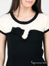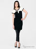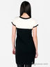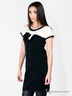 Посадка по фигуре, короткая длина. Отрезной декоративный лиф, украшенный рюшами. Короткий рукав и округлый вырез горловины окантованы черной тканью.