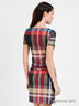 Стильное платье приталенного силуэта из плотной неэластичной ткани с рисунком. Округлый вырез горловины, короткий рукав, застежка на молнию сбоку, на втачном поясе расположены шлевки, в которые продет тонкий ремешок. Декоративные клапаны. Отличный вариант на каждый день.