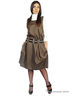 Модельное женское платье без рукавов. Выполнено из натурального материала благородного коричневого цвета. Имеет интересный дизайн и оригинальную отделку в виде контрастной обтачки по линии горловины. Платье свободного силуэта с поясом на широких шлевках. Юбка с карманами в боковых швах и несколькими складками в верхней части. Модель отлично сочетается с водолазкой или рубашкой с длинным рукавом.